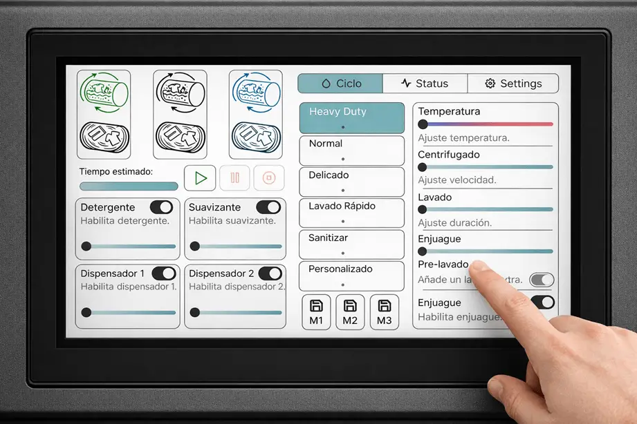 Configure desde la pantalla touch la temperatura, tiempos de lavado y enjuague y la potencia de centrifugado. Su interfaz responde con precisión incluso con dedos mojados.