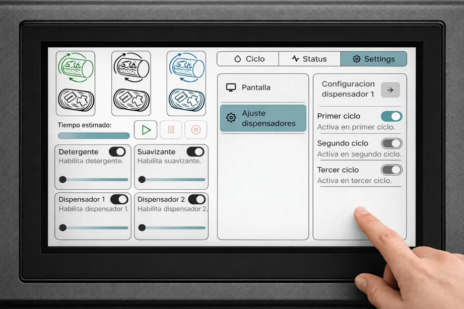 Dispone de dosificación automática para detergente, suavizante y dos productos adicionales configurables. El sistema, basado en bombas de succión, administra con precisión las cantidades definidas por el usuario.