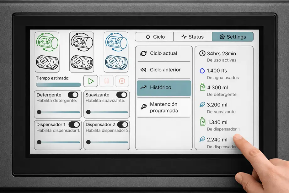 Acceda a un registro histórico de horas de uso de su lavadora. Puede visualizar consumo histórico de agua, detergente o suavizante permitiendo un control de gastos detallado de su lavandería.
