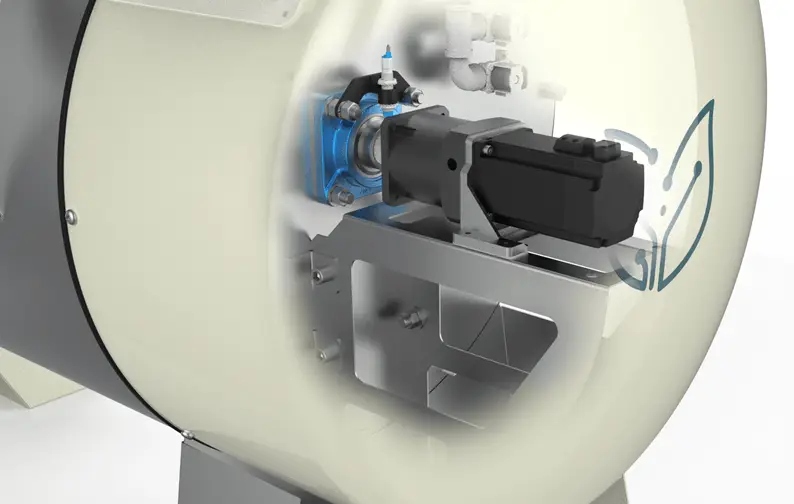 Servomotor equipado con reductor planetario, asegura un sistema de bajo consumo eléctrico, lavado y centrifugado con alta eficiencia, sin poleas, libre de mantenimiento y de alta potencia reduciendo significativamente mantenimientos y costos.